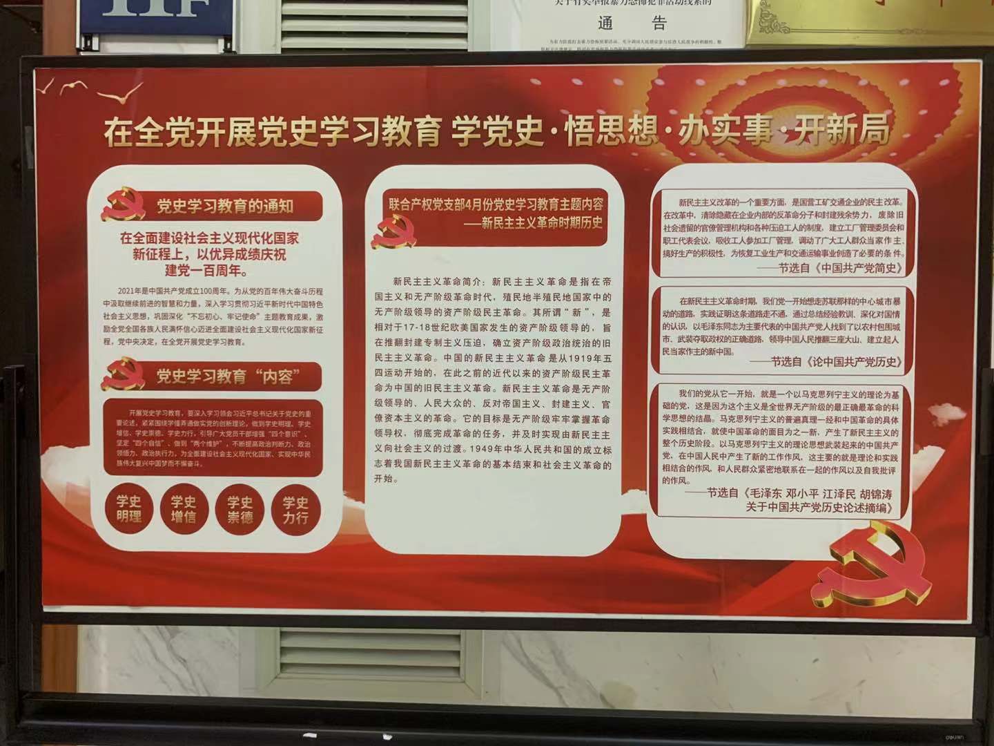 自黨史學(xué)習(xí)教育開展以來(lái),聯(lián)合產(chǎn)權(quán)黨支部通過(guò)制定學(xué)習(xí)計(jì)劃、制作月度學(xué)習(xí)宣傳欄、組織黨員定期學(xué)習(xí)討論等方式持續(xù)推進(jìn)學(xué)習(xí)教育工作。下一步,聯(lián)合產(chǎn)權(quán)黨支部將繼續(xù)深入開展黨史學(xué)習(xí)教育主題活動(dòng),切實(shí)把黨史學(xué)習(xí)教育與總結(jié)經(jīng)驗(yàn)、觀照現(xiàn)實(shí)、推動(dòng)工作結(jié)合起來(lái),切實(shí)做到學(xué)黨史、悟思想、辦實(shí)事、開新局,鍛造“不折不扣、不偏不倚”的政治執(zhí)行力,以優(yōu)異成績(jī)迎接建黨一百周年。