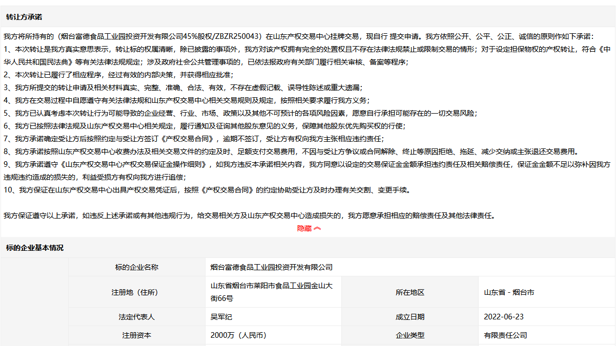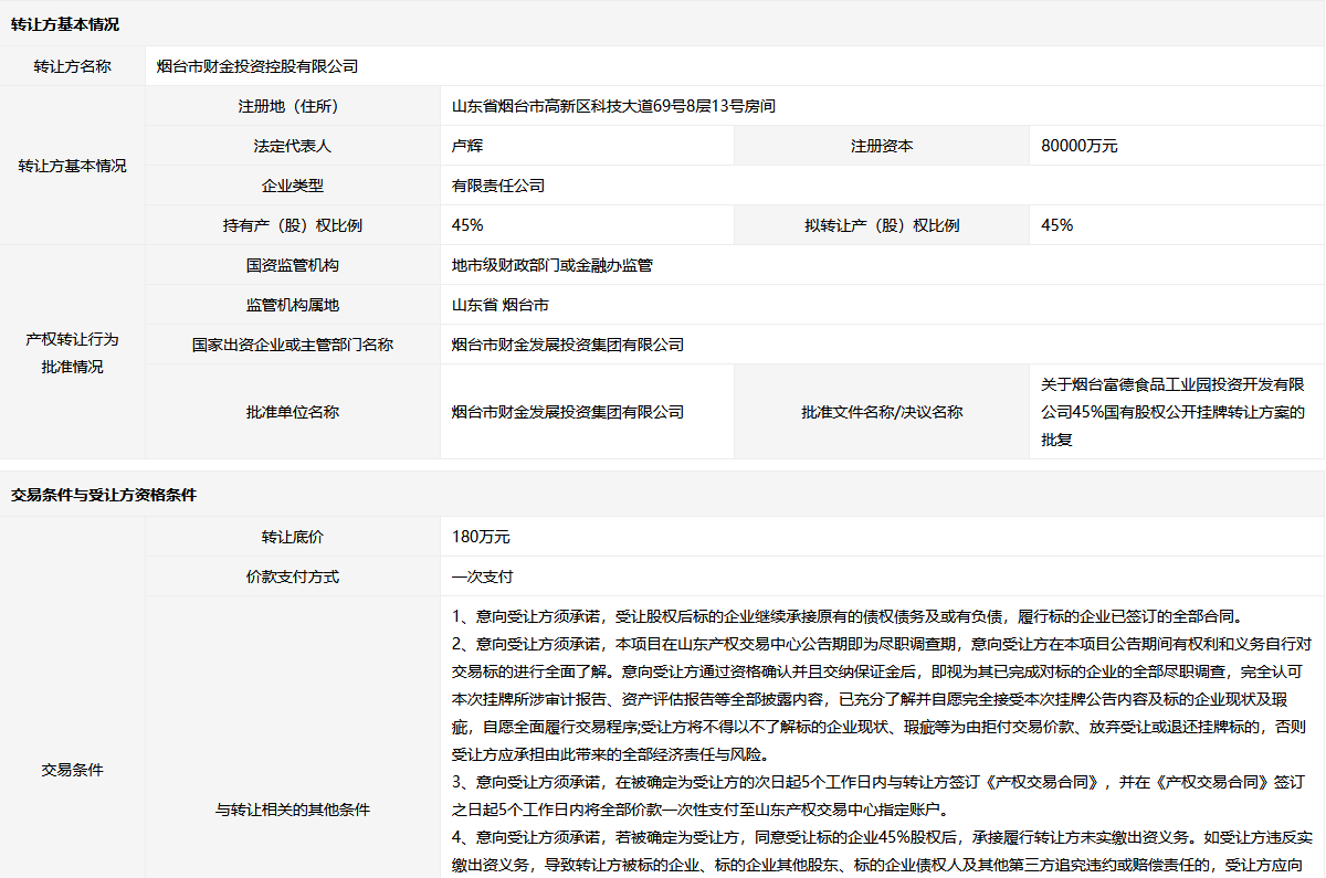 煙臺富德食品工業(yè)園投資開發(fā)有限公司45%股權(quán)