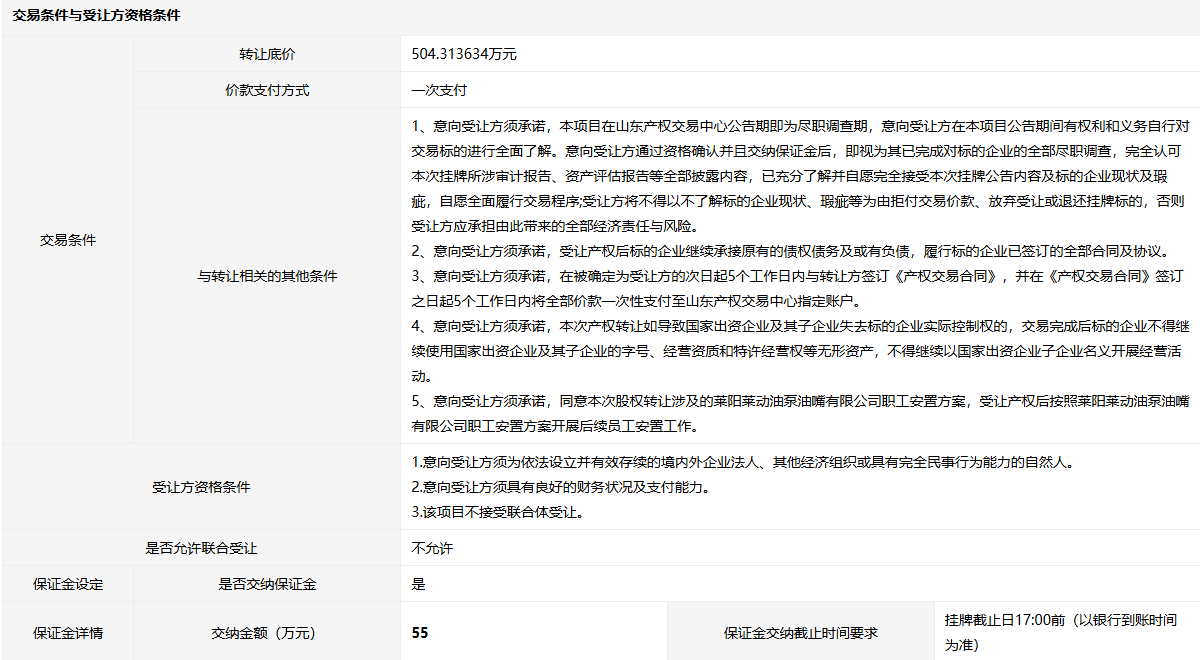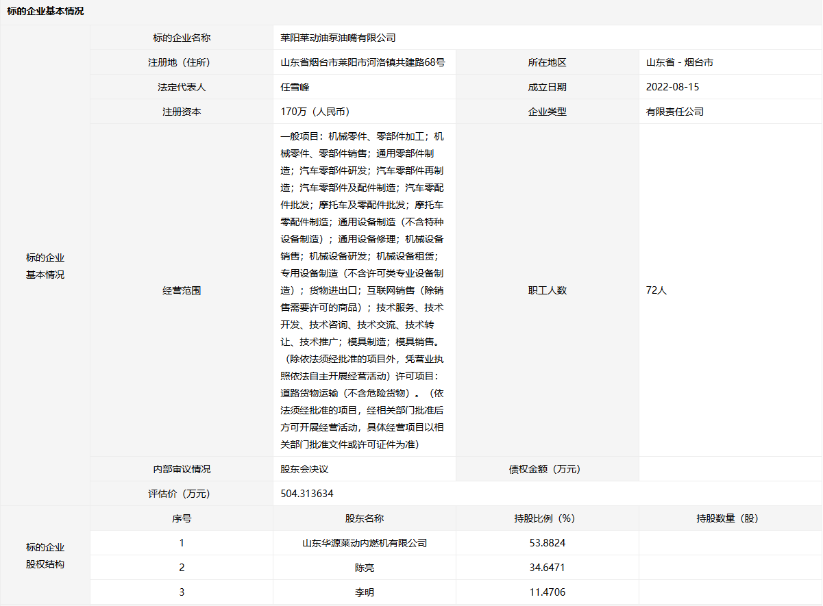 萊陽(yáng)萊動(dòng)油泵油嘴有限公司53.8824%股權(quán)